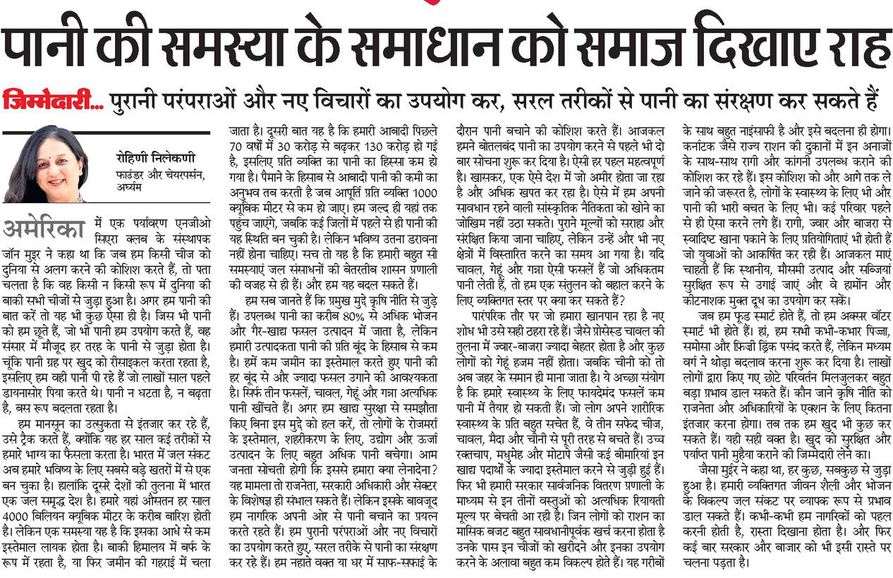 हम सब जानते हैं कि प्रमुख मुद्दे कृषि नीति से जुड़े हैं। उपलब्ध पानी का करीब 80% से अधिक भोजन और गैर-खाद्य फसल उत्पादन में जाता है, लेकिन हमारी उत्पादकता पानी की प्रति बूंद के हिसाब से कम है। हमें कम जमीन का इस्तेमाल करते हुए पानी की हर बूंद से और ज्यादा फसल उगाने की आवश्यकता है। सिर्फ तीन फसलें, चावल, गेहूं और गन्ना अत्यधिक पानी खींचते हैं। अगर हम खाद्य सुरक्षा से समझौता किए बिना इस मुद्दे को हल करें, तो लोगों के रोजमर्रा के इस्तेमाल, शहरीकरण के लिए, उद्योग और ऊर्जा उत्पादन के लिए बहुत अधिक पानी बचेगा। आम जनता सोचती होगी कि इससे हमारा क्या लेनादेना? यह मामला तो राजनेता, सरकारी अधिकारी और सेक्टर के विशेषज्ञ ही संभाल सकते हैं। लेकिन इसके बावजूद हम नागरिक अपनी ओर से पानी बचाने का प्रयत्न करते रहते हैं। हम पुरानी परंपराओं और नए विचारों का उपयोग करते हुए, सरल तरीके से पानी का संरक्षण कर रहे हैं। हम नहाते वक्त या घर में साफ-सफाई के दौरान पानी बचाने की कोशिश करतेे हैं। आजकल हमने बोतलबंद पानी का उपयोग करने से पहले भी दो बार सोचना शुरू कर दिया है। एेसी हर पहल महत्वपूर्ण है। खासकर, एक ऐसे देश में जो अमीर होता जा रहा है और अधिक खपत कर रहा है। ऐसे में हम अपनी सावधान रहने वाली सांस्कृतिक नैतिकता को खोने का जोखिम नहीं उठा सकते। पुराने मूल्यों को सराहा और संरक्षित किया जाना चाहिए, लेकिन उन्हें और भी नए क्षेत्रों में विस्तारित करने का समय आ गया है। यदि चावल, गेहूं और गन्ना ऐसी फसलें हैं जो अधिकतम पानी लेती हैं, तो हम एक संतुलन को बहाल करने के लिए व्यक्तिगत स्तर पर क्या कर सकते हैं?